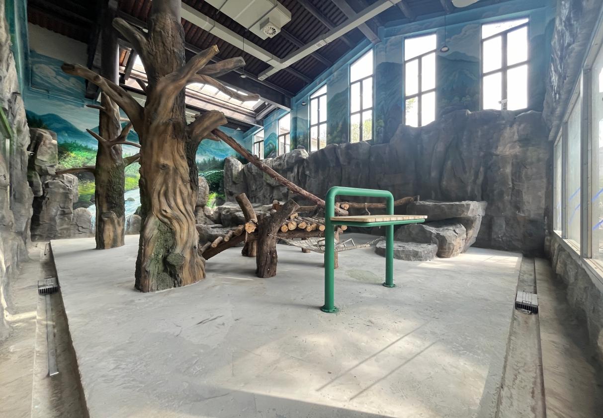 从居住环境来看,这里完全贴合大熊猫的生存习性。室内活动场配有栖架、吊床、秋千、垫料池等丰容装置,墙面有仿大熊猫自然生境彩绘。室内兽舍及室内运动场通过中央空调和新风系统实现全年温控,并配有温湿度报警系统。室外活动场地则配有流苏、紫薇、香樟、朴树、蓝花楹、枫树等乔木,搭配杜鹃、扶桑、石榴等灌木及草坪。