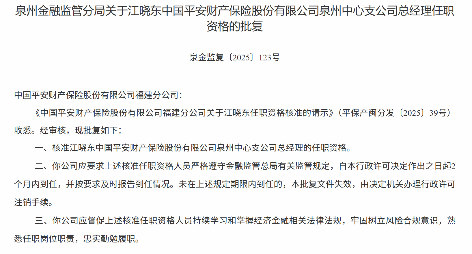 11月14日,泉州金融监管分局发布关于江晓东中国平安财产保险股份有限公司泉州中心支公司总经理任职资格的批复,核准江晓东中国平安财产保险股份有限公司泉州中心支公司总经理的任职资格。